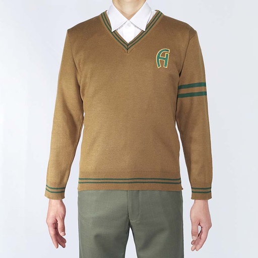 Chompa escolar cuello V en tejido de punto, color camel con detalles verde botella. Ideal para uso diario en instituciones educativas.